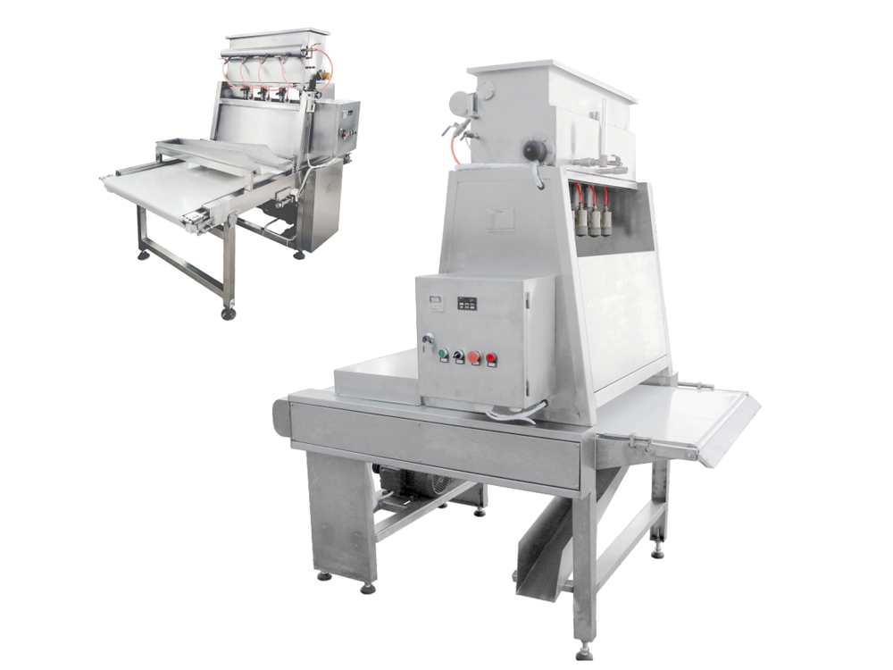 型號  PTJ600B型  功能  將糖漿均勻的噴灑在法餅表面上?! √厣 ?、噴糖漿的速度、狀態(tài)便于調(diào)節(jié),輸送帶變頻調(diào)速,具有自動防跑偏裝置,清潔裝置,便于清洗維護(hù)。  2、機(jī)器安全、防護(hù)、可靠、穩(wěn)定性高。電氣安全符合國家標(biāo)準(zhǔn)?! 〖夹g(shù)參數(shù)
