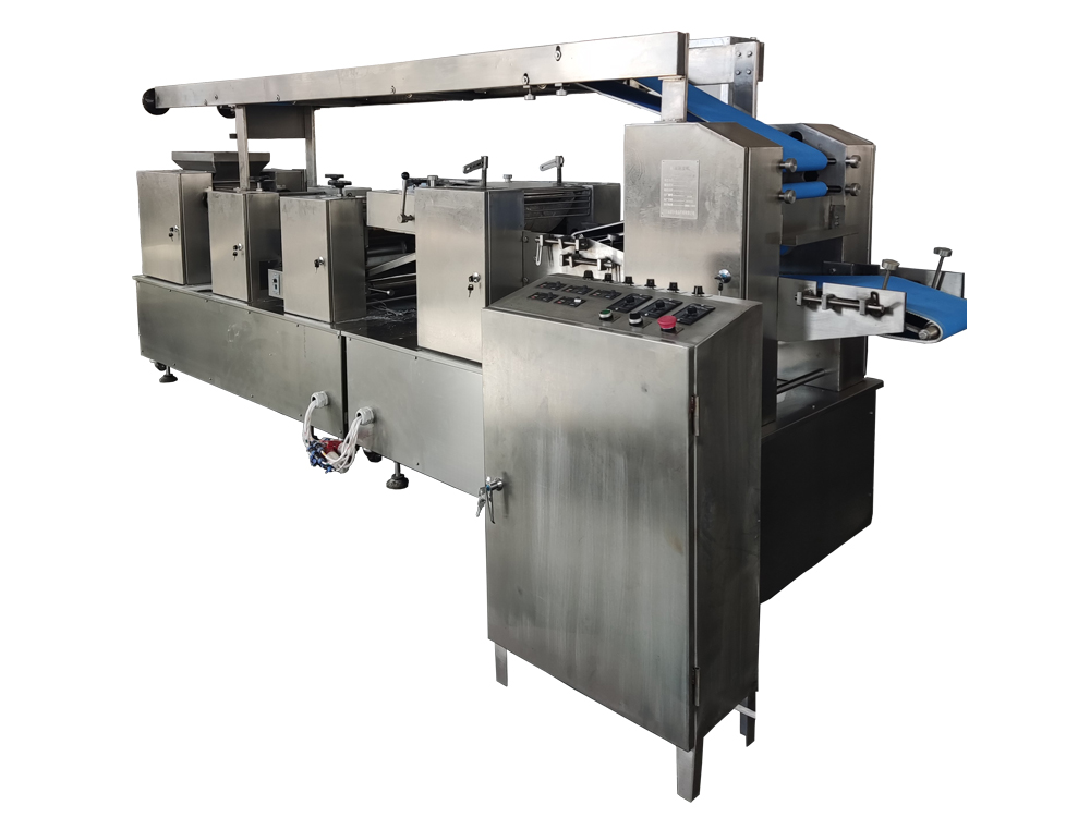 制皮機(jī)為臥式成型機(jī),通過傳送機(jī)構(gòu)將各道軋輥線速度比合理分配,實(shí)現(xiàn)從投料到制皮成型自動(dòng)化生產(chǎn)。適用于餃子皮、餛飩皮、燒麥皮、蒸餃皮、以及燙面類面皮成型。