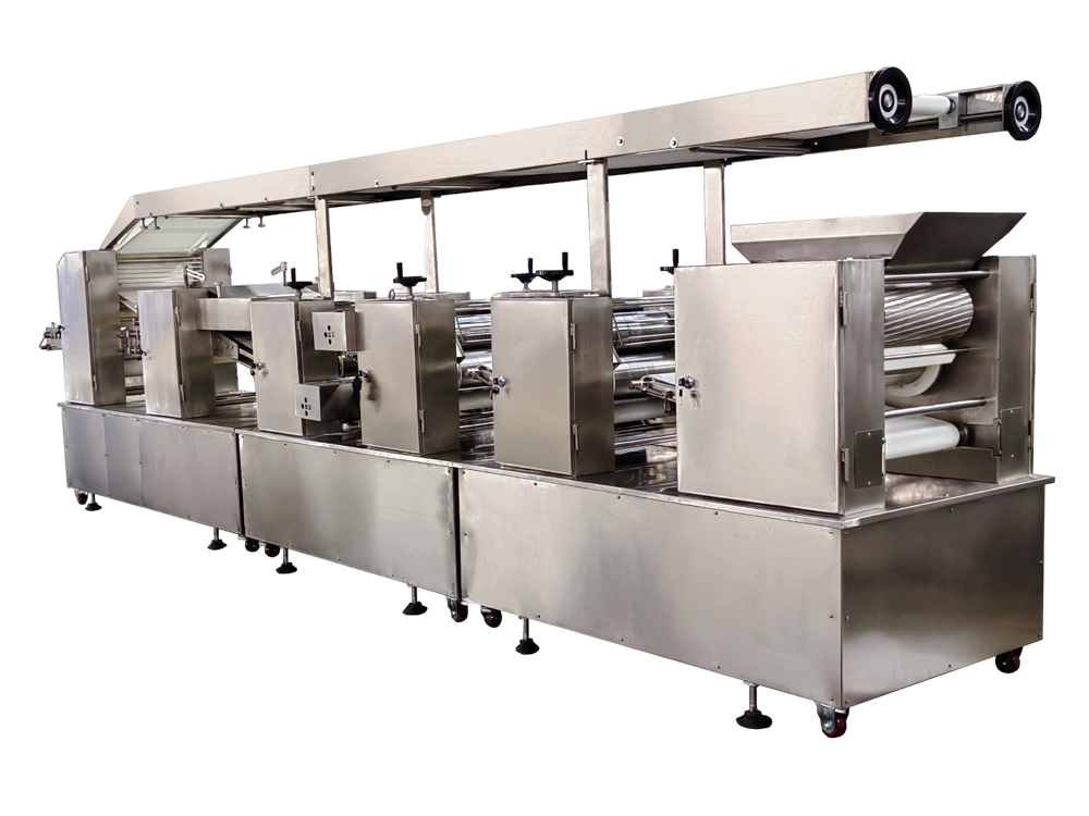 制皮機(jī)為臥式成型機(jī),通過(guò)傳送機(jī)構(gòu)將各道軋輥線(xiàn)速度比合理分配,實(shí)現(xiàn)從投料到制皮成型自動(dòng)化生產(chǎn)。適用于餃子皮、餛飩皮、燒麥皮、蒸餃皮、以及燙面類(lèi)面皮成型。