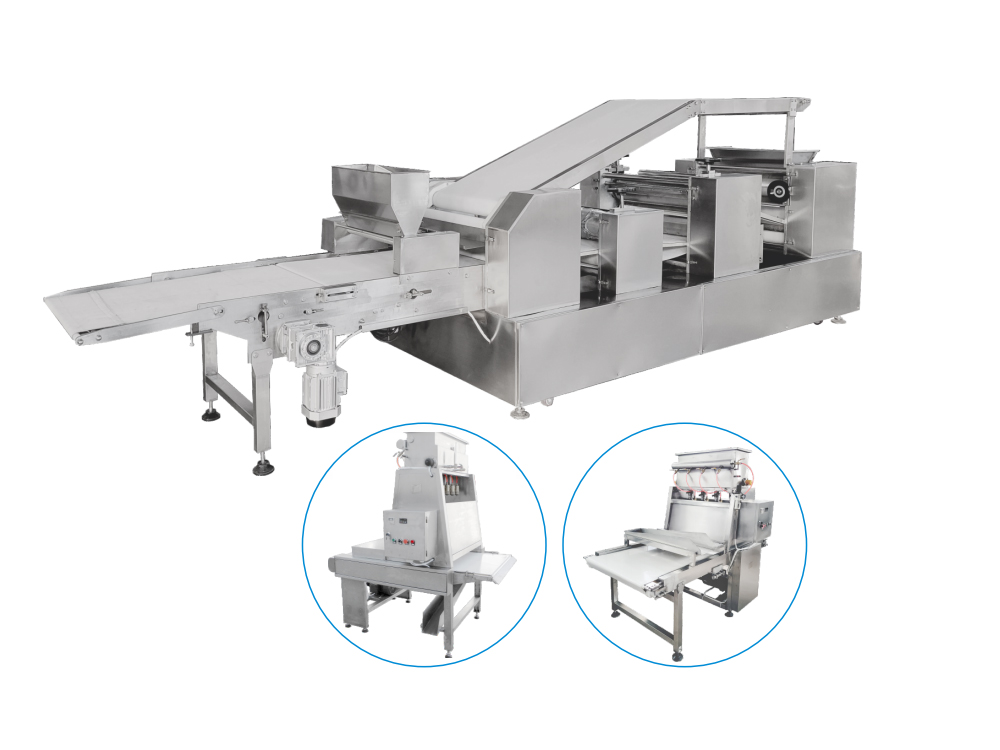 拌漿機將糖漿加熱攪拌均勻→和面→面團(tuán)擠出輸送→面餅成型→一次烘烤→噴糖→二次烘烤→冷卻